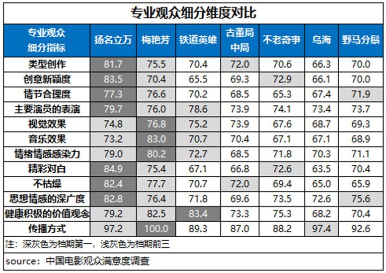 在专业观众评价中,《扬名立万》获得了12项指标中7项指标的最高分评价,其中创意新颖度、精彩对白得分均超83分,不枯燥、思想情感的深广度和类型创作得分均超81分。《梅艳芳》的视觉效果、音乐效果、情绪情感感染力及传播方式得到了专业观众的最高评价。《铁道英雄》的健康积极的价值观念得到了最高评分。另外,《古董局中局》的类型创作、《不老奇事》的创意新颖度、《乌海》的传播方式、《野马分鬃》的思想深广度等指标也均居专业观众评价的前三位。