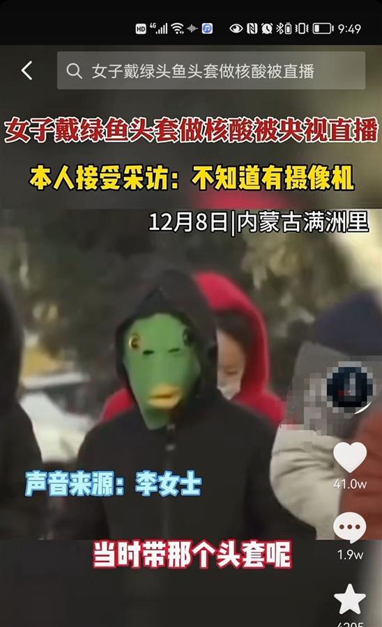 12月10日晚,极目新闻一篇题为《央视新闻里戴绿鱼头套走红的男孩:才上五年级,想逗防疫人员开心》的报道引发关注,有网友注意到,有媒体报道称新闻里戴绿鱼头套的是一位女士,因此对当事人的性别产生质疑。