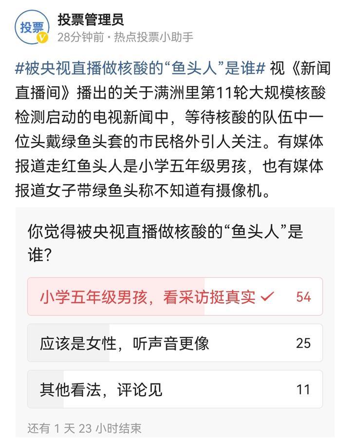 极目新闻记者注意到,在新闻第三方平台,发起了对于此次新闻报道中当事人的性别投票,问题是“你觉得被央视直播做核酸的‘鱼头人’是谁”,选项共有三个,第一个选项是小学五年级男孩,看采访挺真实;第二个选项是应该是女性,听声音更像;第三个选项则是其他看法,评论见。