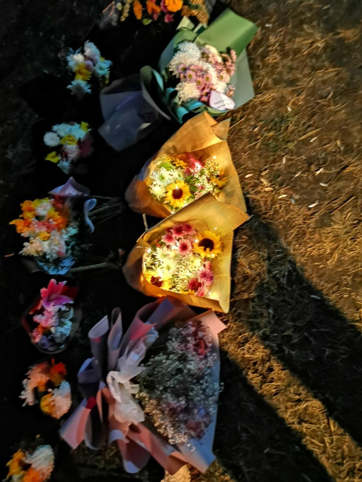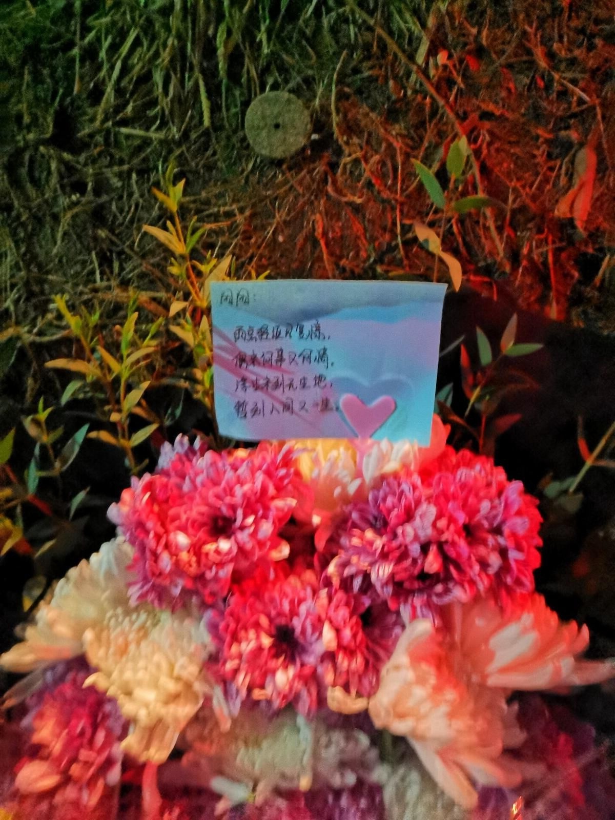 浑南区奥林匹克生态公园昏暗的路灯下,一束束鲜花在岸边顺次排放,两束自带闪光灯的鲜花格外显眼。还有市民摆上蜡烛,一根根点燃,一排“心”在夜空下闪耀。