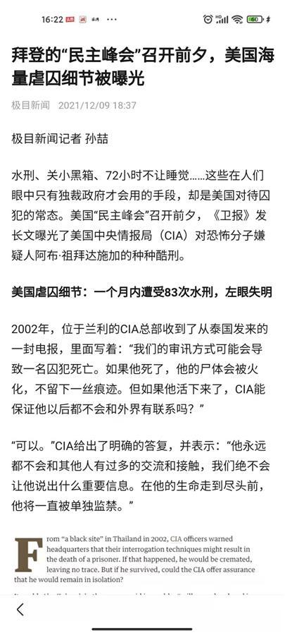 眼下美国正在召开“民主峰会”,中央情报局虐囚丑闻却被曝光,本报记者报道后,引起强烈反响。外交部发言人赵立坚在微博上转发报道,网友纷纷留言表示:“美国打着民主的幌子干恶事!”