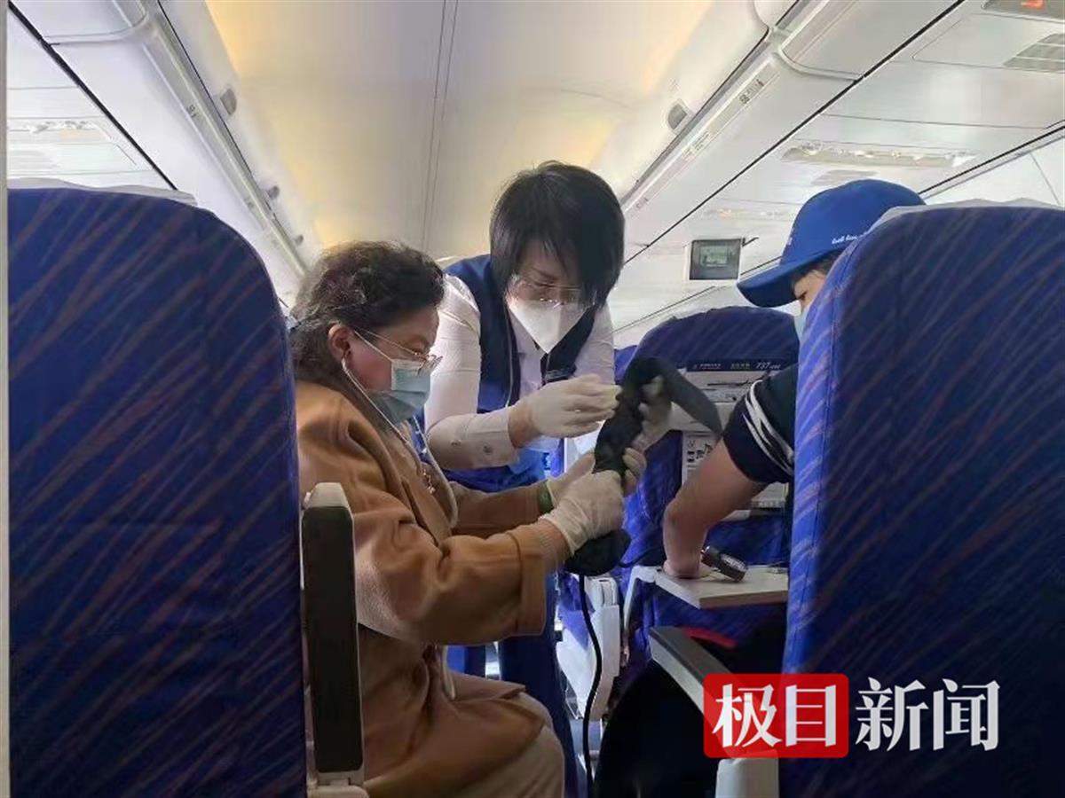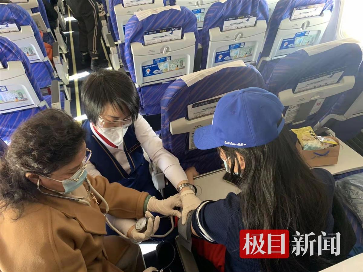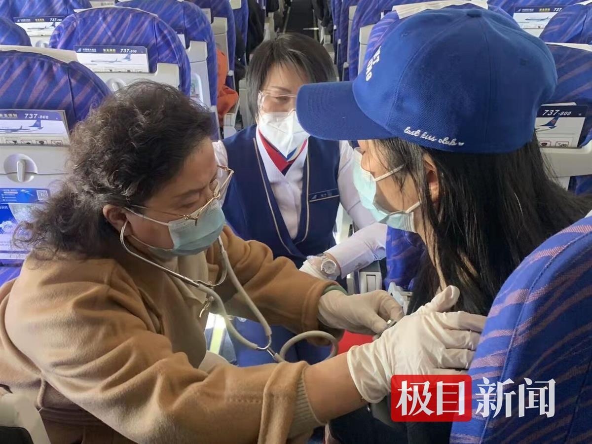 为保障旅客的人身安全,乘务组有条不紊地展开机上急救程序:报告机长、广播找医生、开启机上应急医疗箱,随时准备为旅客提供救助。幸运的是,通过机上广播发现协和医院内分泌科袁教授此时也在飞机上!袁教授主动加入机上急救,用应急设备为晕倒旅客测量血压和脉搏,开始紧张救助。万幸的是,初步检查结果显示,旅客晕倒是由于低血糖,在吃下乘务组送来的果汁、饼干等食物后,意识清醒了一些,身体状态也恢复了许多。