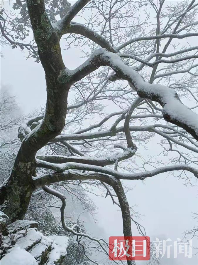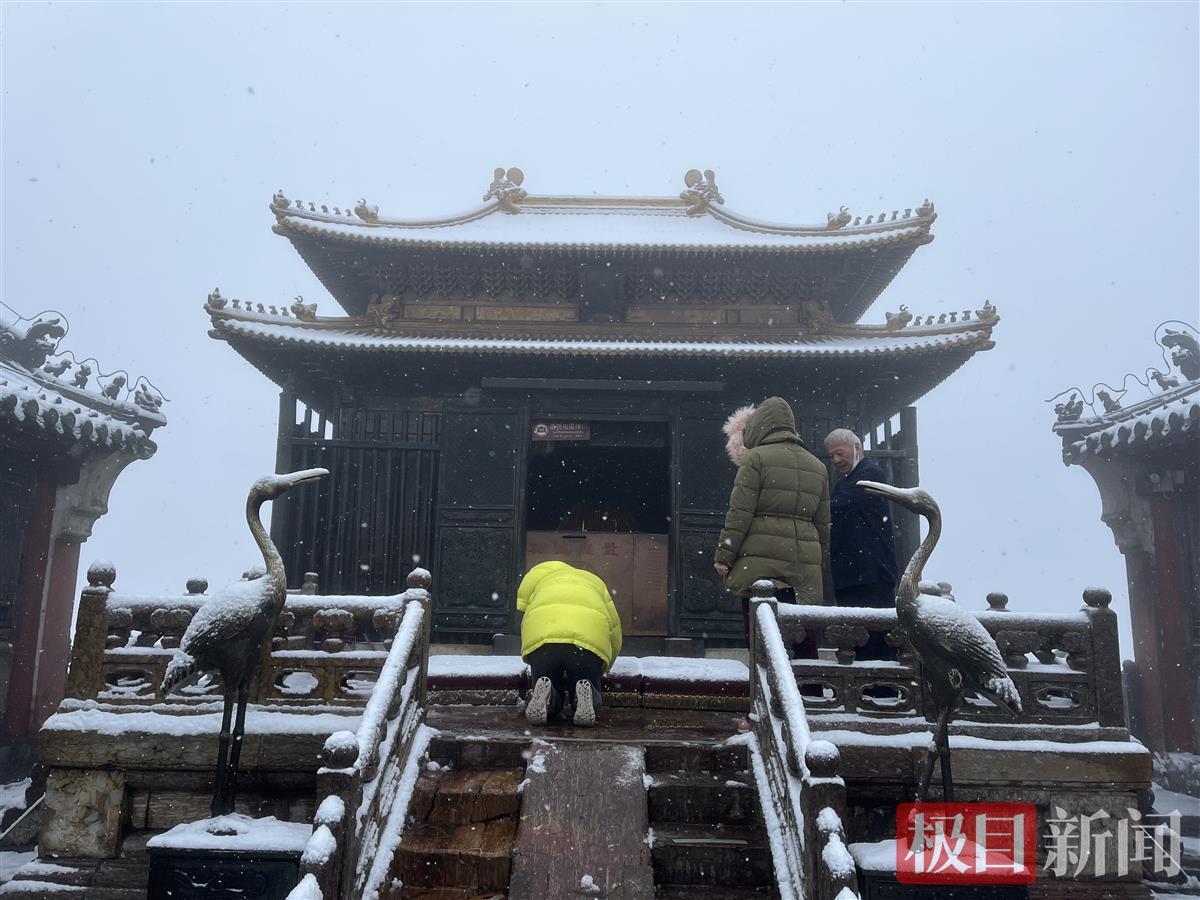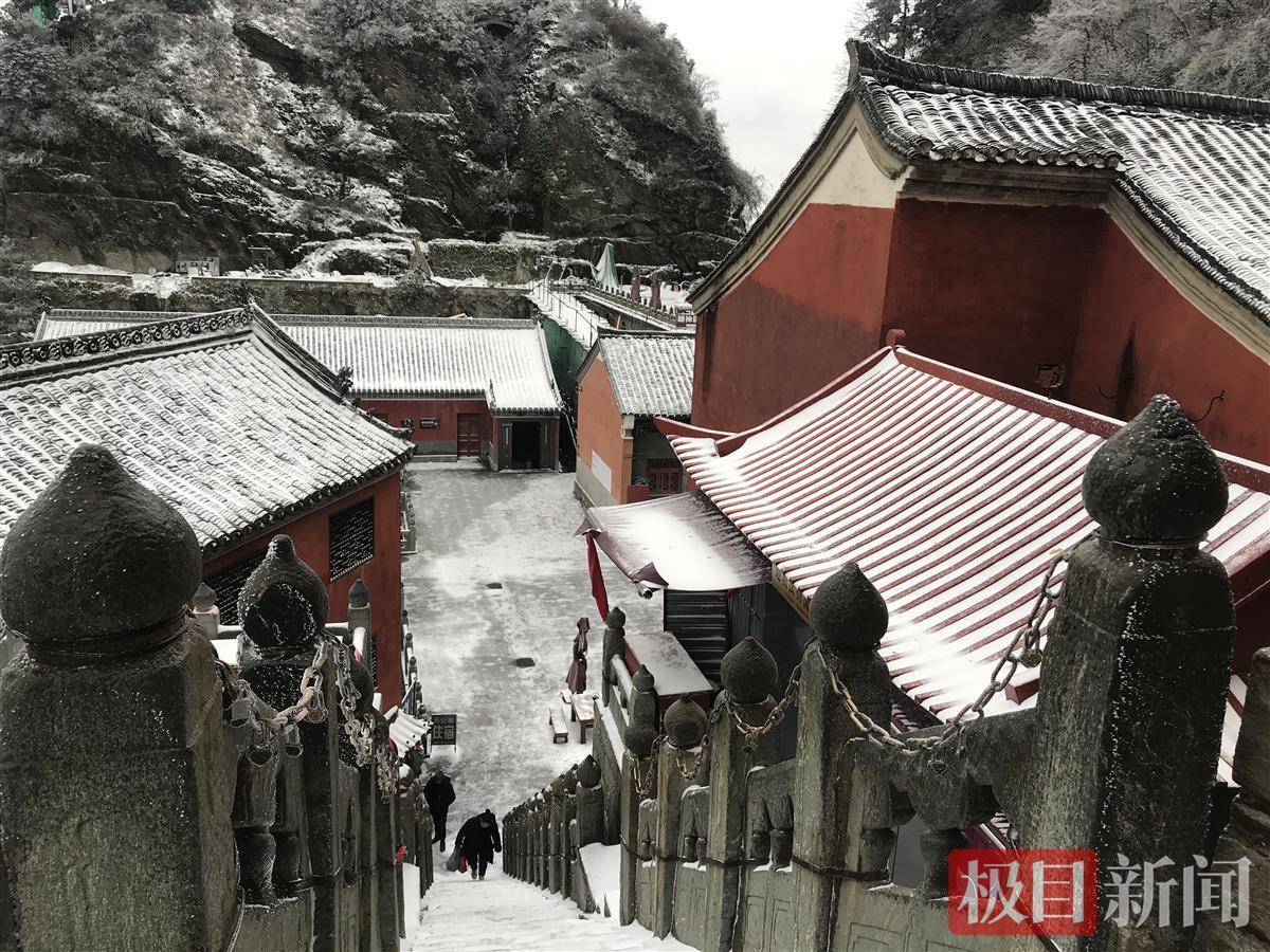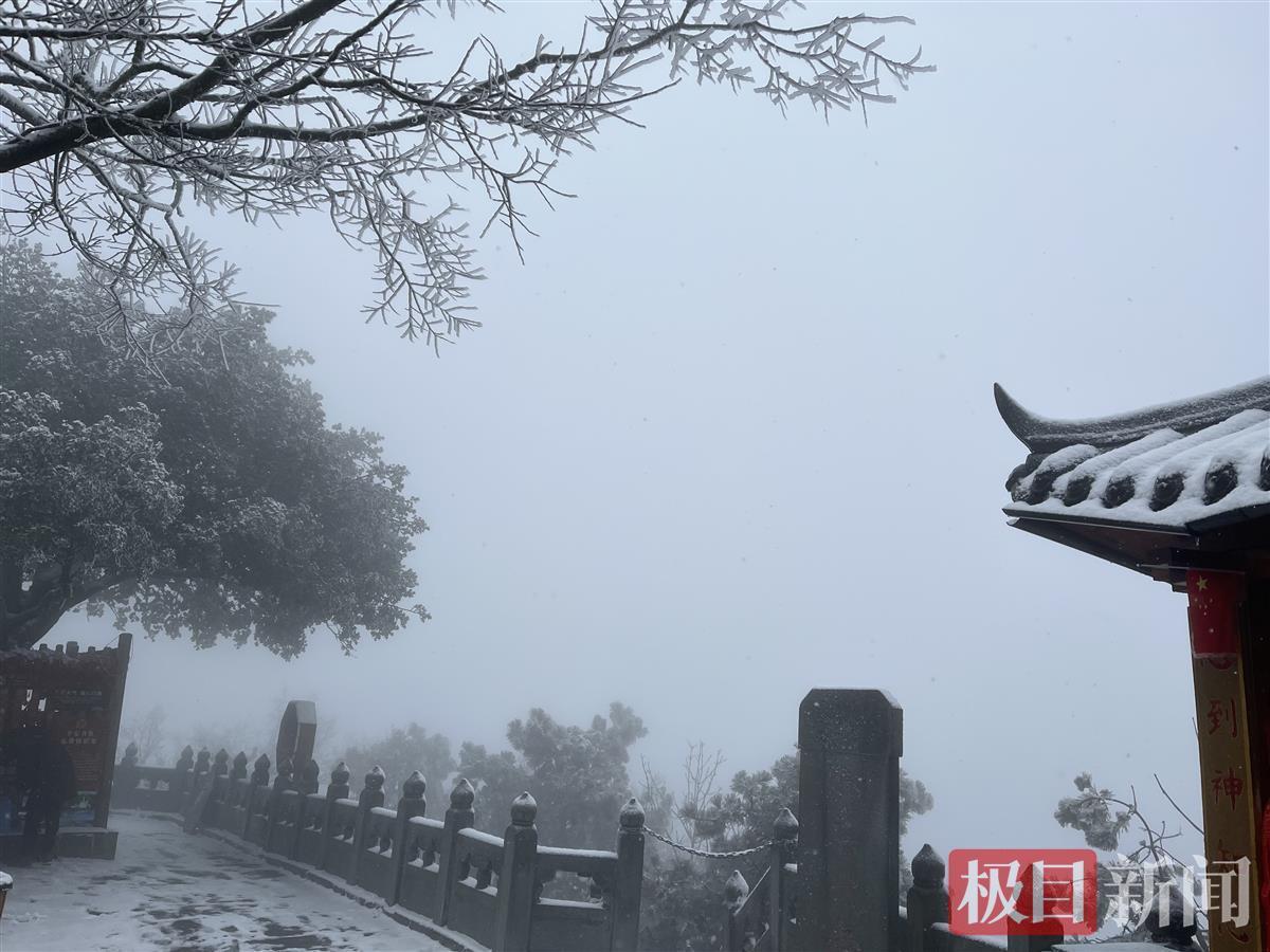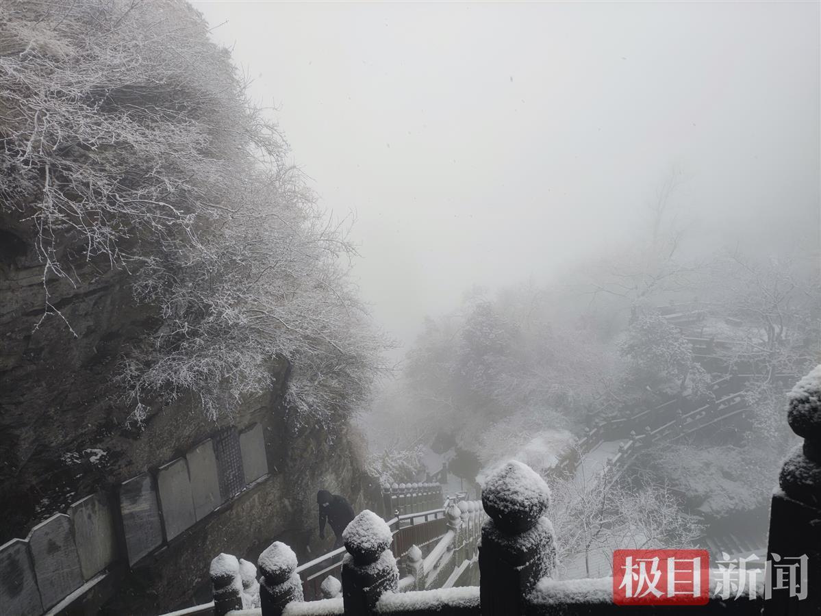 受冷空气影响,武当山景区气温持续下降,12月11日清晨,金顶景区再次迎来降雪天气,气温下降至零度。雪花在金顶上空飞舞,整个金顶仿佛进入水墨世界。站在金顶眺望,目之所及皆被白雪覆盖,唯有红墙显得格外美艳,游客纷纷被雪景吸引,打卡留念偶遇武当的“雪色浪漫”。