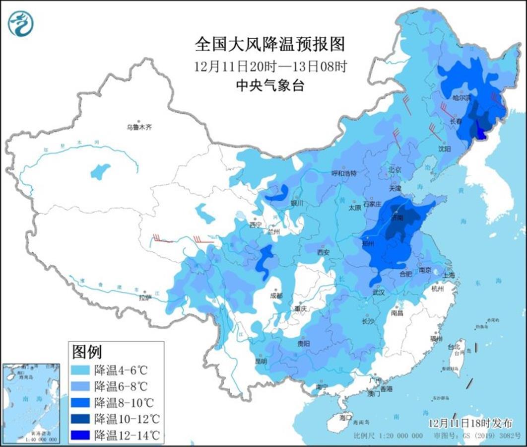 中央气象台11日18时继续发布大风降温预报:受冷空气影响,11日20时至13日08时,中东部地区气温将下降4℃-6℃。