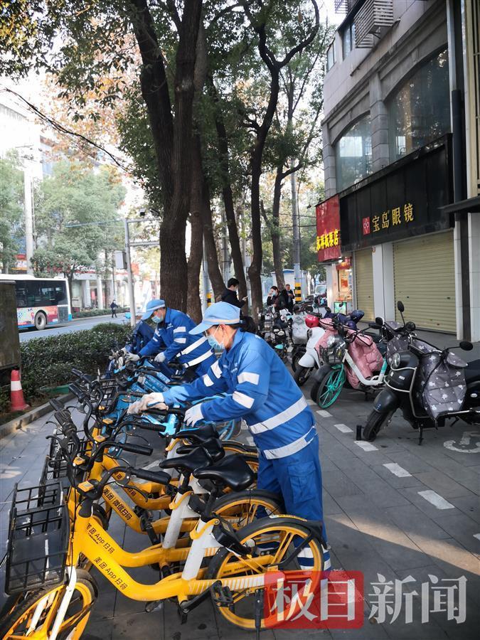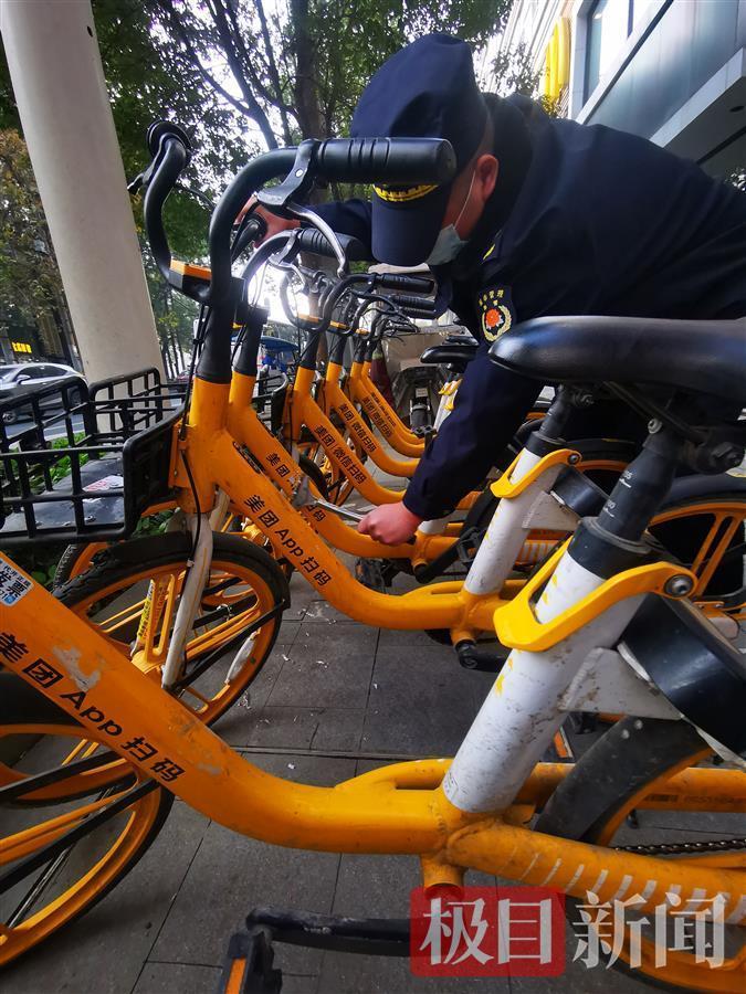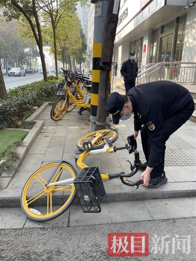 在武昌洪山路上,水果湖街道执法中心的一名城管协管员看见一辆共享单车倒伏在地,他连忙扶起,并推进停车点摆放整齐。另一名协管员看到单车上有一张牛皮癣,便用塑料铲子,小心铲除。