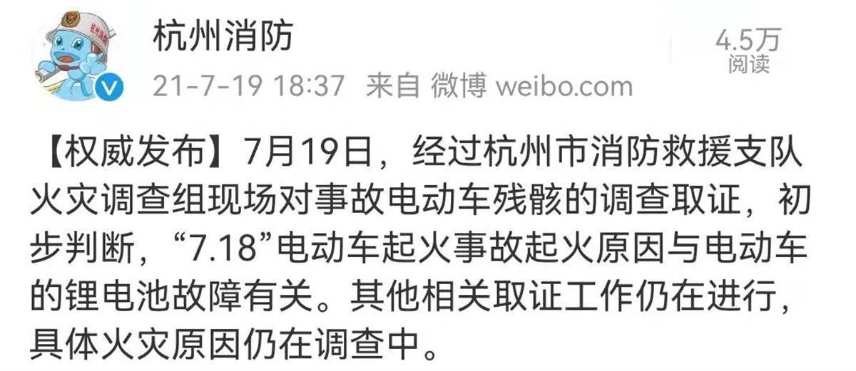 事故发生后,杭州消防救援支队通报称,初步判断“7.18”电动车起火事故起火原因与电动车的锂电池故障有关。市场监管局发布通报称,涉事车主车辆向上城区“满意车行”购买,品牌为CZYMH型号为TDR1572Z,该品牌电动自行车由杭州迅驰雅马哈工贸有限公司生产,该企业目前委托无锡邦度科技有限公司贴牌生产。关于涉事车辆电池是否进行更换,因现场未发现更换记录,有关情况正作进一步核实。