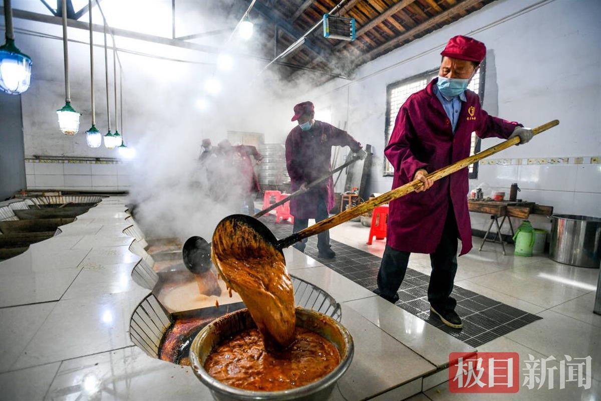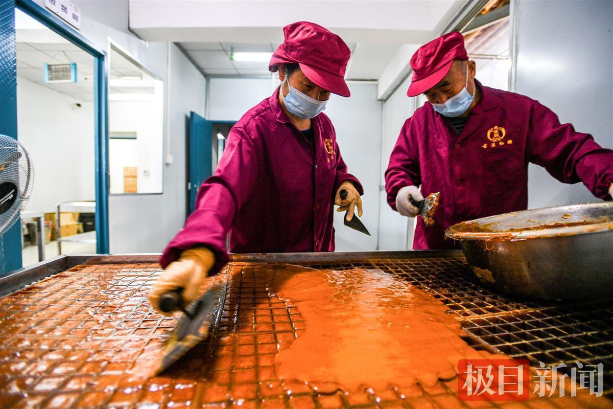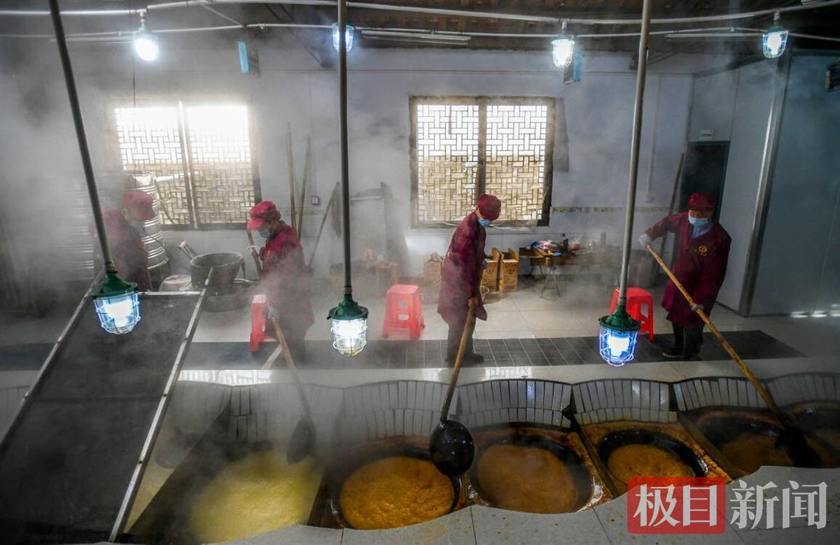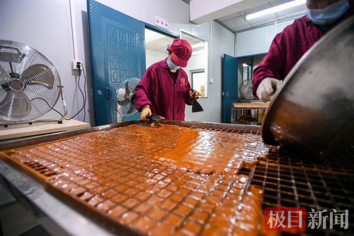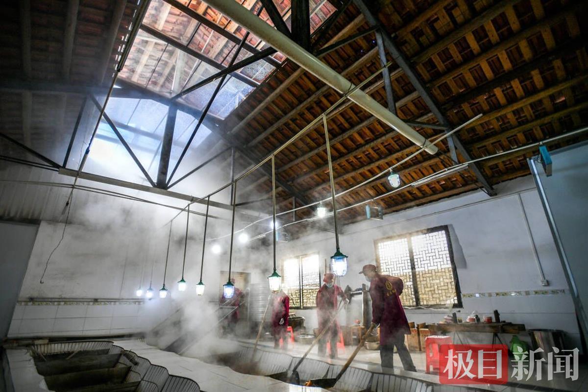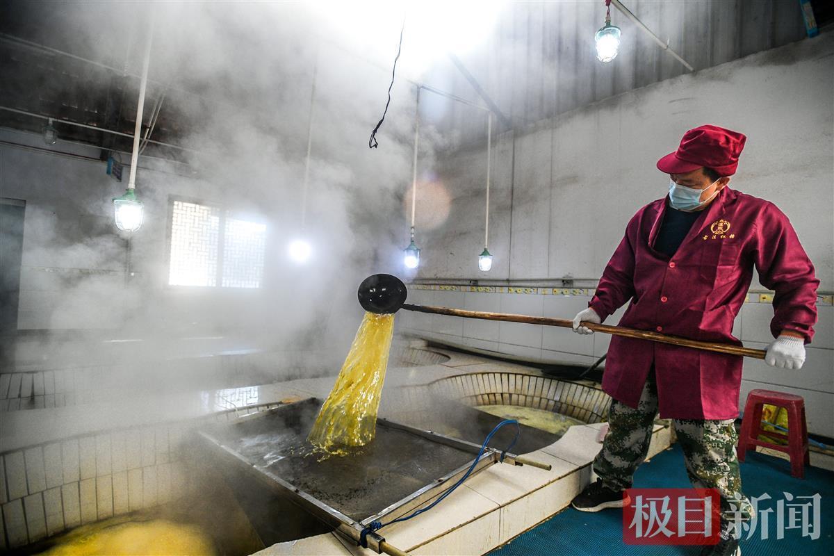 靖响林使用的是“九口连环锅”的古法制糖工艺,采取此种办法可保留甘蔗中的营养成分,制作出来的红糖,口感天然醇正。近日,极目新闻记者走进了制糖车间,只见工人们正在对甘蔗进行榨汁、过滤、赶水、摇瓢、打沙、成型等步骤,整个车间蔗糖飘香。这些工人都是来自毛家冲村或周边其他村。