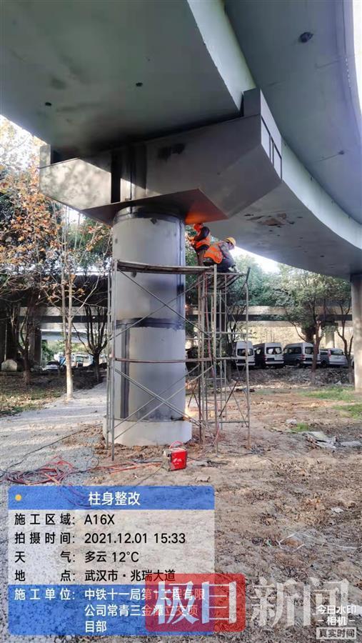 12月12日,极目新闻记者在三环线青菱立交桥下看到,这座桥梁由19根独柱桥墩支撑,在每根桥墩上,一个“蝴蝶”造型,像翅膀一样托起桥梁。武汉桥隧事务中心设施科科长苏利说,这是在独柱墩加钢盖梁和辅助支座而形成的造型,“它可以起到加固的作用,确保桥梁不会倾覆。”