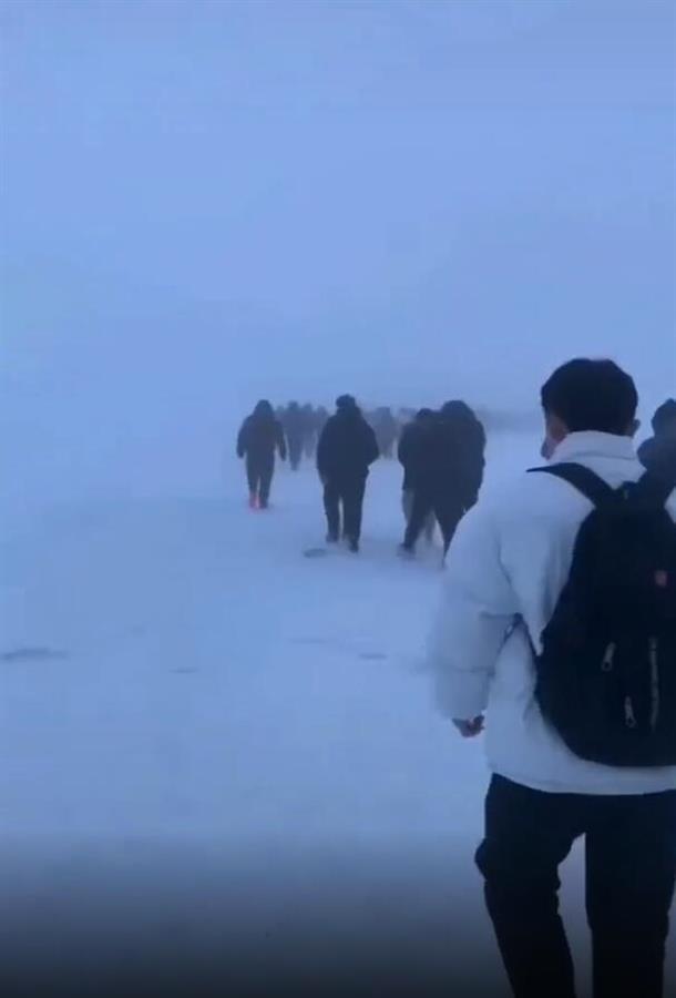 现场视频显示,一片白茫茫的雪地里,一群身穿羽绒服,背着书包的学生排成一个长队往前行走,队伍一眼望不到尽头。