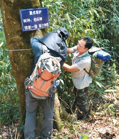 伯乐树是“极小种群野生植物”中的一员,分布于云南新平哀牢山山地中。图为极小种群野生植物综合保护团队队员正在测量伯乐树。
