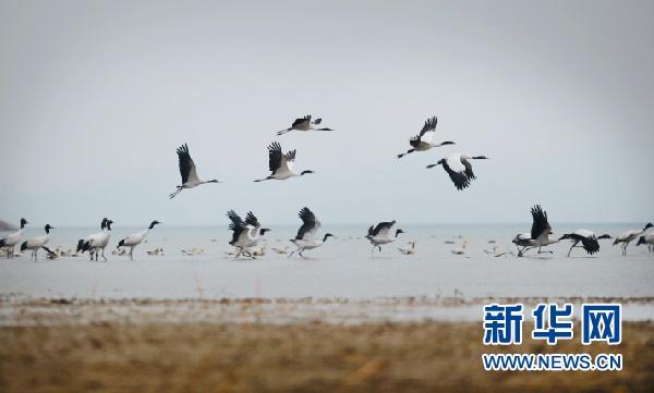 黑颈鹤飞舞草海。新华网 卢志佳 摄