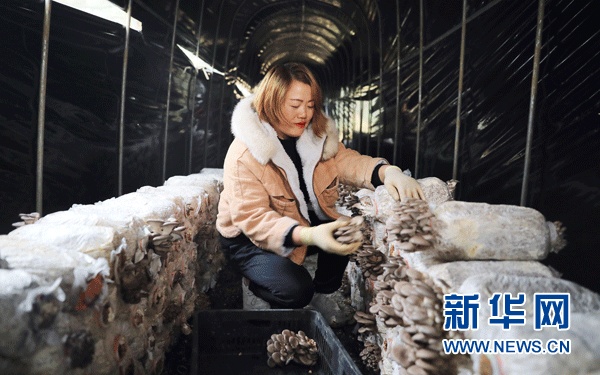 12月5日,三塘镇当地群众在林下食用菌大棚内采收平菇。新华网 卢志佳 摄