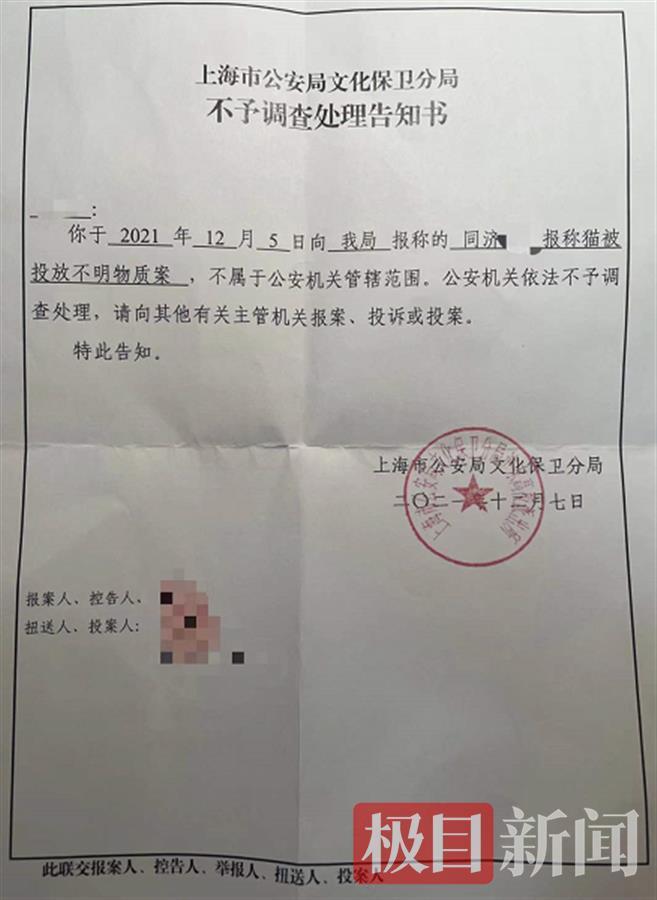爆料帖称,12月5日凌晨,有学生向上海公安部门报警,并将猫粮、猫碗等有关物品送检。8日警方回复,确认在送检物品中检测出猫致死物,但该物不在危险化学品名录中,不构成违法或犯罪行为,因此不予受案。经学生与学校沟通,可以确定流浪猫中毒并非学校后勤做消杀或喷洒农药导致。校方承诺将在监控盲区加装临时监控,而对于学生要求查处并严惩加害人一事,校方表示将尊重警方的处理意见。