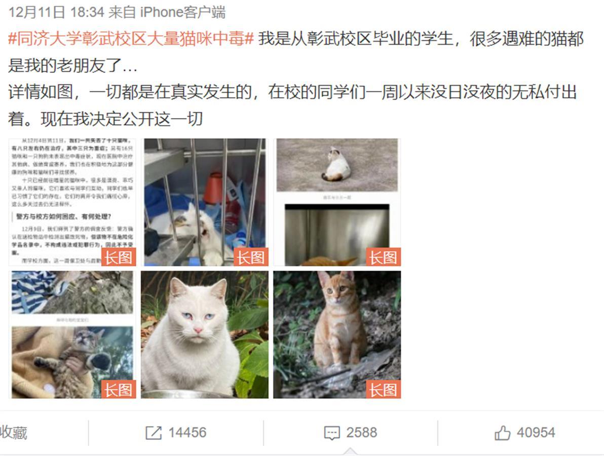 12月11日,有网友爆料称,12月4日晚,有学生在同济大学彰武路校区发现有流浪猫出现走路不稳、抽搐等异常情况,送医后抢救无效身亡。之后,又有学生发现其他流浪猫出现类似异常症状,送医后均检查出肾损伤、肾衰竭等症状。截至12月11日,共有18只流浪猫出现中毒症状,其中10只救治无效死亡。