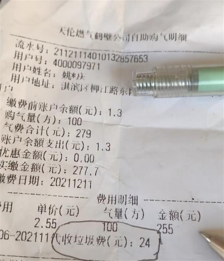 12月11日,河南省鹤壁市的姚先生在缴完天然气费用后发现,自己买了255元的天然气,最终却被收了279元费用。13日,天伦燃气鹤壁公司工作人员告诉极目新闻记者,多收的24元钱,是他们替政府部门代收的垃圾处理费。