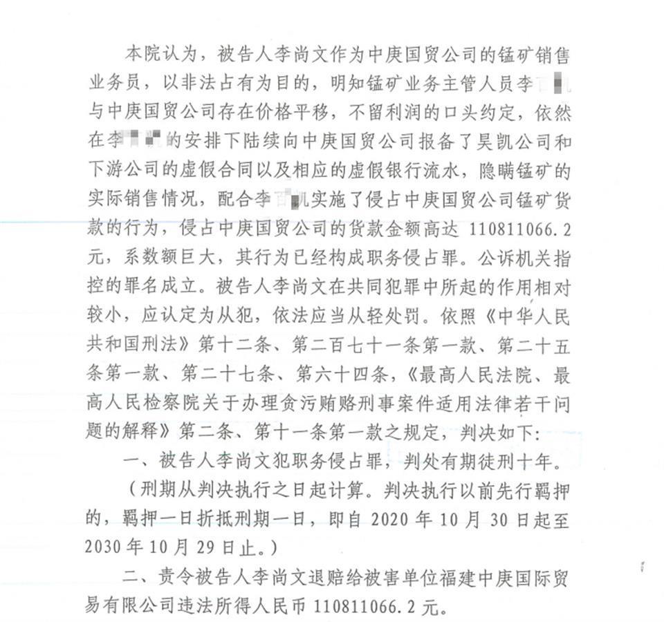 2021年9月3日,马尾区法院宣判,李尚文犯职务侵占罪,判处有期徒刑10年,同时责令他退赔给被害单位中庚国贸违法所得1.1亿余元。