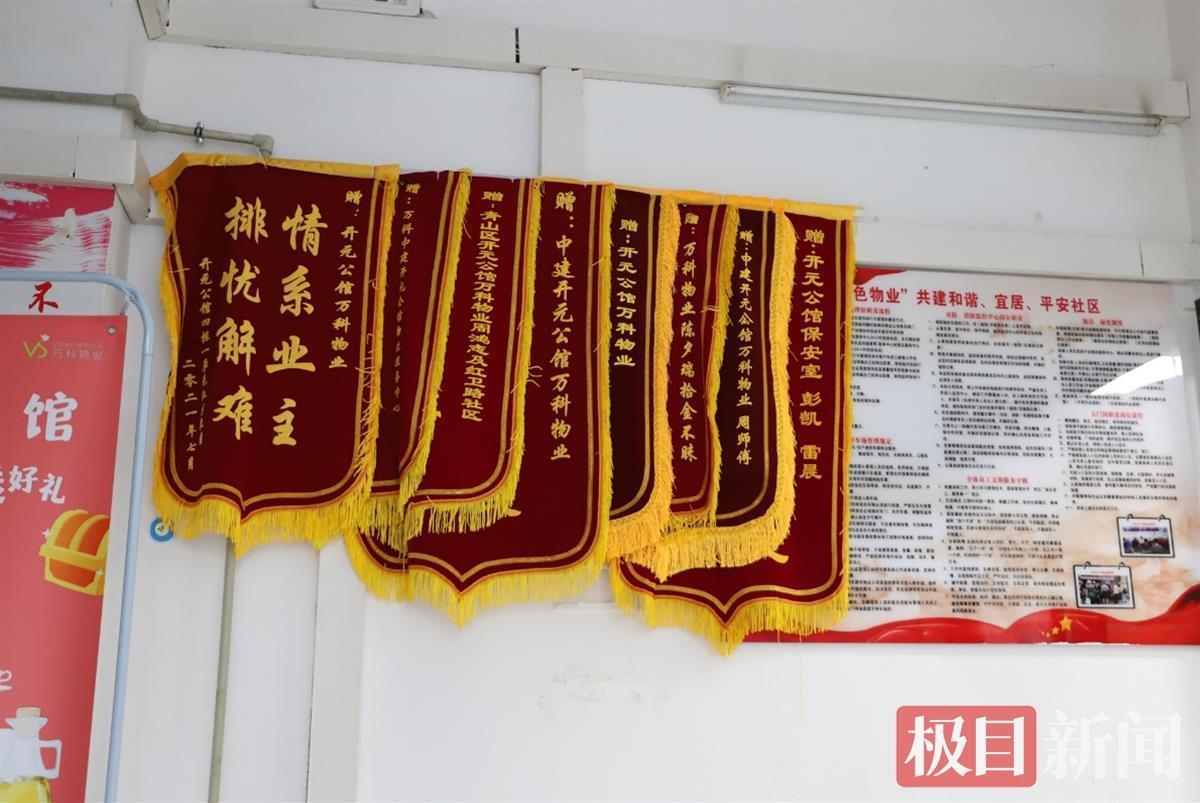 “情系业主伸援手,尽职尽责品德高”“服务第一全心为民,客户至上暖至人心”“情系业主,排忧解难”……物业服务中心门口,悬挂着一面面锦旗,进入小区几个月的时间,这支团队已经获得了不少业主的肯定。