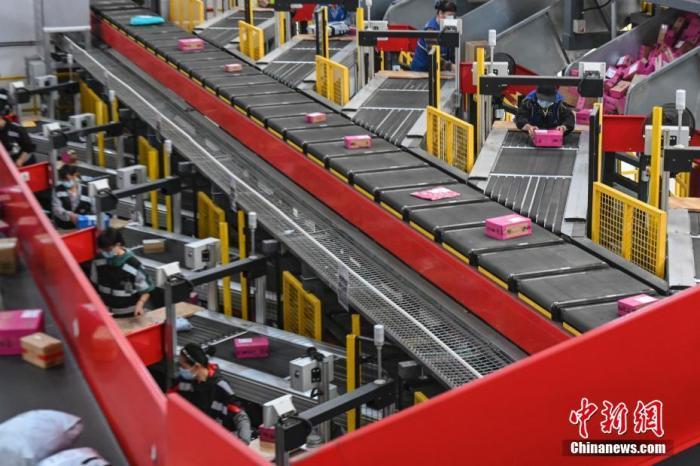 资料图:工作人员将快递包裹放入分拨传送带上。中新社记者 陈骥旻 摄