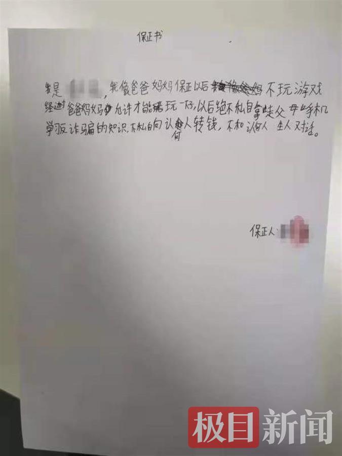 “我保证以后不玩游戏,经过爸爸妈妈的允许才能玩。还要学习反诈知识,不私自向任何人转钱,不和任何生人对话。”12月12日,11岁的明明(化名)在爸爸的陪同下,来到东湖公安分局磨山派出所,当着民警的面写下了这份“可爱的”保证书。