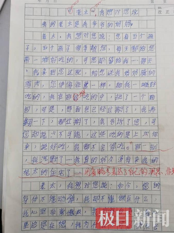 “这是我读过的最感人的文章,字里行间都流露出自己的真情实感,也表达了老太对自己的爱没有什么可以取代,感人至深。”14日,杜老师告诉记者,在邵楼小学读书的孩子大多是留守儿童,他们与父母接触的时间不多,和老人都感情很深,因此当天听到小晗的作文时,同学们便产生了情感共鸣。