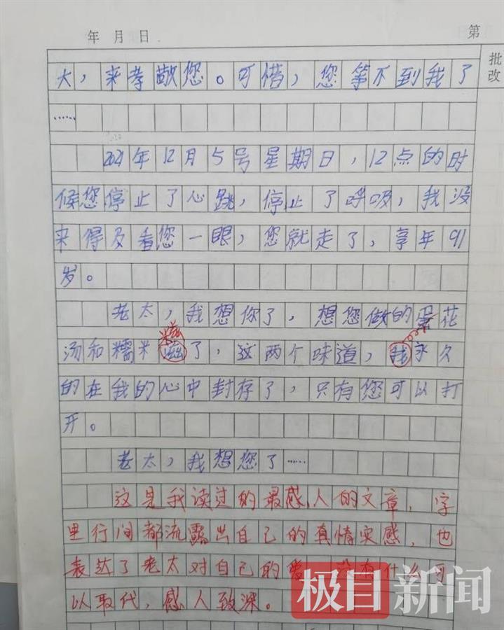 “2021年12月5号星期日,12点的时候您停止了心跳,停止了呼吸,我没来得及看您一眼,您就走了,享年91岁。”极目新闻记者注意到,小晗的这篇作文主要是缅怀其刚刚过世的老太(曾祖母)。