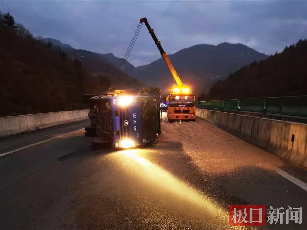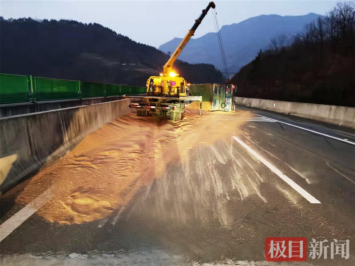 12月14日18时许,在G59呼北高速公路上,一辆满载7吨小麦的货车发生侧翻,小麦倾洒一地,幸无人员受伤。危急时刻,保康交警迅速联合路政、施救、养护等多部门连夜施救。