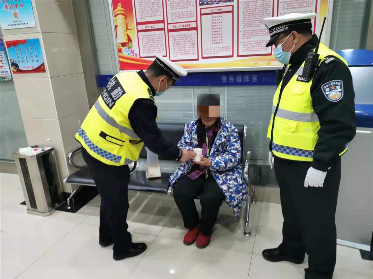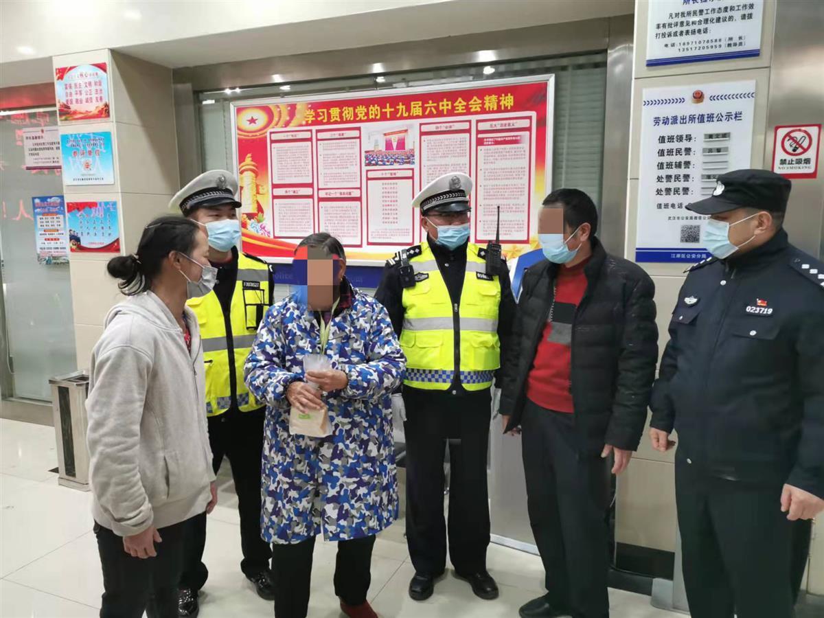 12月14日晚,武汉市公安局江岸区交通大队三中队民警熊涛、辅警姜明清在解放公园路惠济路路口执勤时,发现一位太婆在路边徘徊,上前询问老人是否需要帮助,得知老人独自外出,一时忘了回家的路。老人既说不出自己的姓名,也无法告知家属的联系方式,显得十分着急。