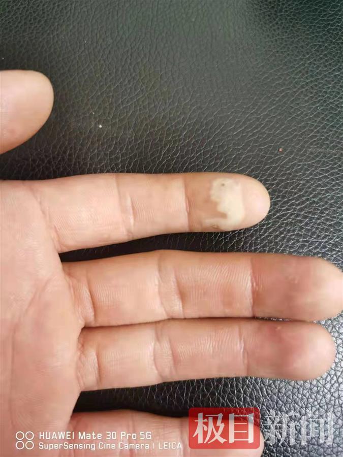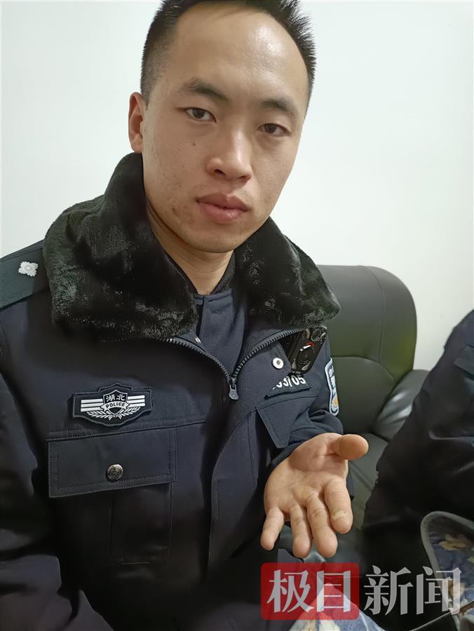 12月15日,在恩施市公安局龙凤坝派出所内,民警冯铭左手食指上被烫出的水泡依旧赫然可见。他向极目新闻记者回忆了12日的那场大火中,自己拖出冒火气罐的惊险瞬间。
