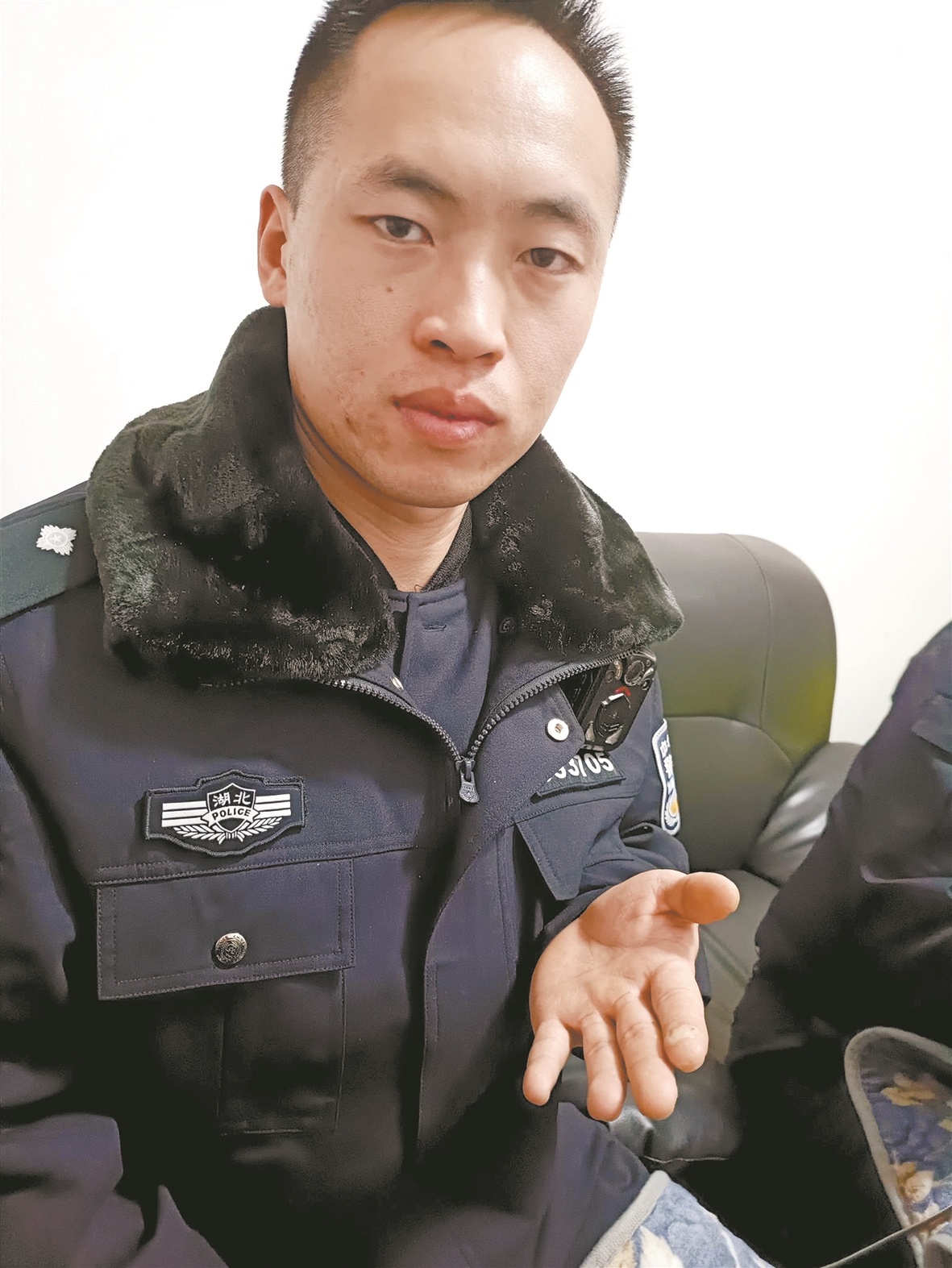 12月15日,在恩施市公安局龙凤坝派出所内,民警冯铭左手食指上被烫出的水疱依旧赫然可见。他向极目新闻记者回忆了12日的那场大火中,自己拖出冒火气罐的惊险瞬间。