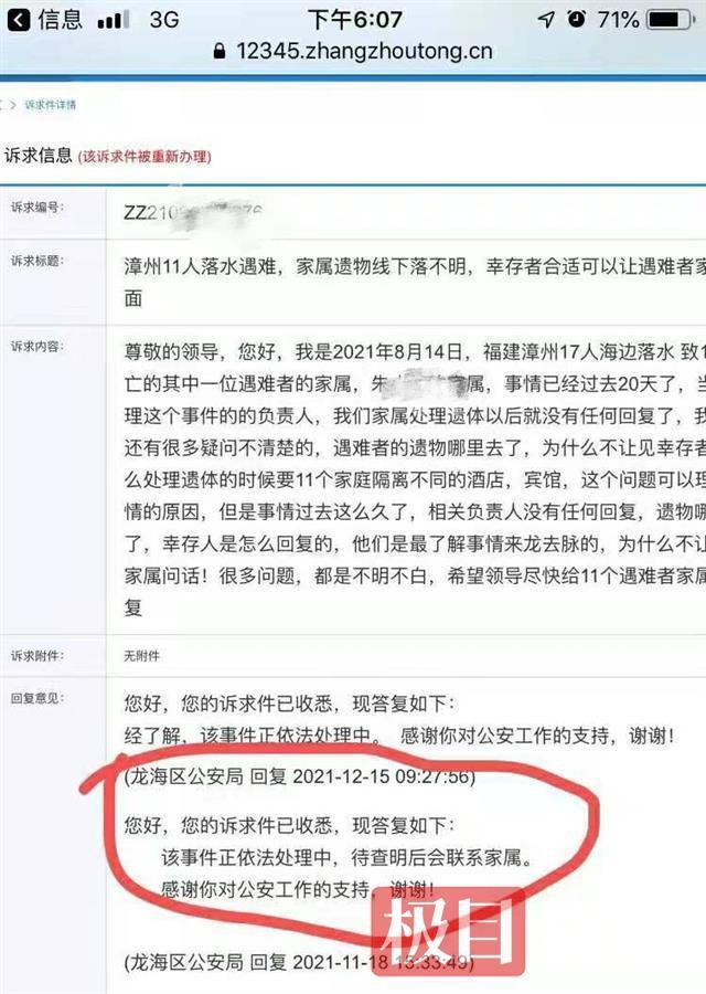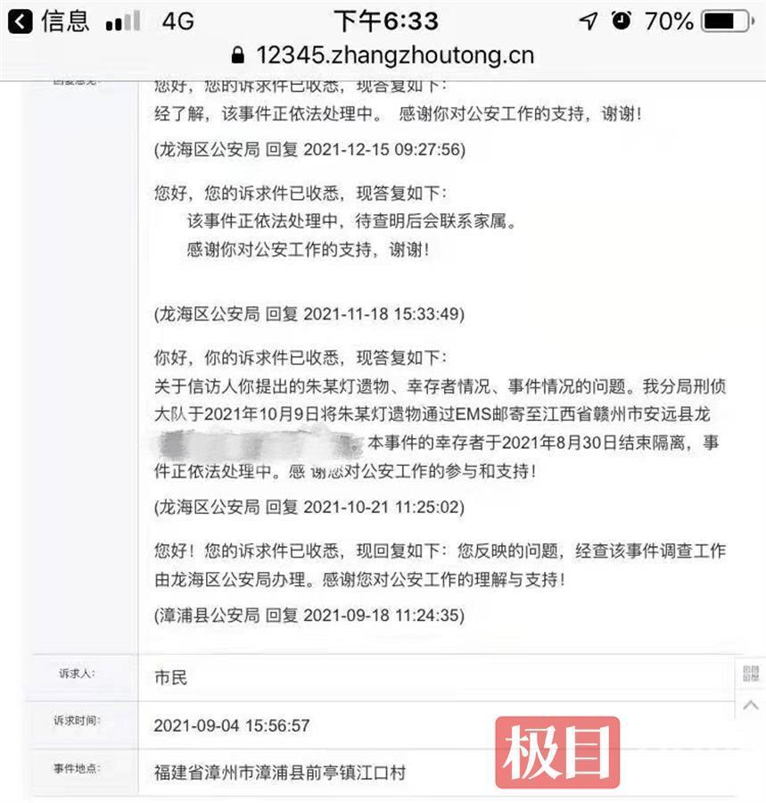 遇难者朱小光(化名)的父亲朱先生将该诉求通过漳州12345反映,漳浦县公安局于9月18日回复称,该事件的调查工作由龙海区公安局办理;龙海区公安局在11月18日和12月15日回复称“该事件正在依法处理”;10月21日龙海区公安局回复道,朱小光的遗物已邮寄至其江西老家,事件中的幸存者于8月30日解除隔离,事件正依法处理中。