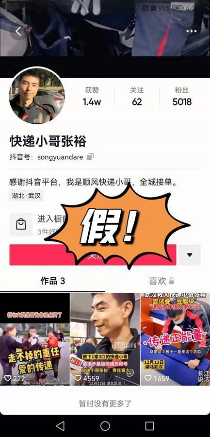 救人快递小哥张裕的英勇事迹,经极目新闻率先报道后,引发全国亿万网友关注并点赞。12月16日,张裕向极目新闻记者反映,抖音平台出现了“快递小哥张裕”等账号,系他人冒充,他本人暂时没有官方认证的个人账号,请广大网友不要相信。