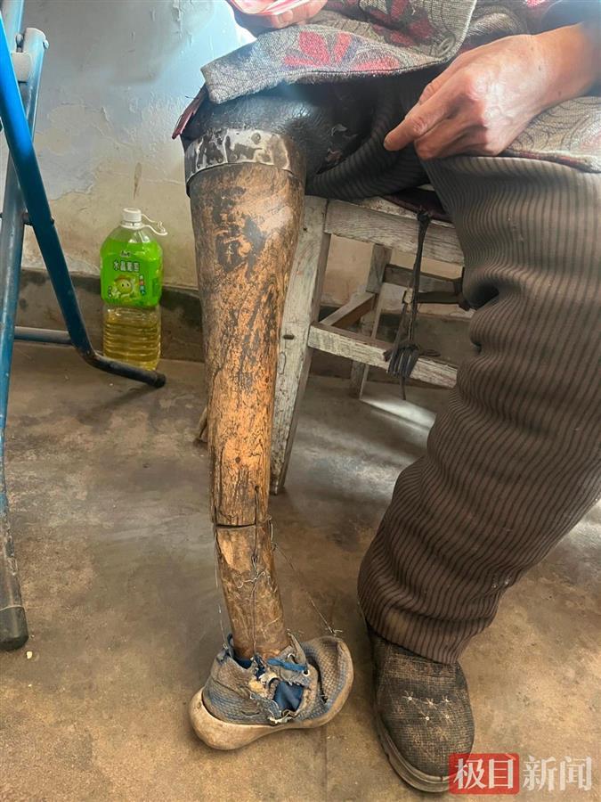 韩香目前用的已经是第三副假肢,用了二三十年了。比小腿长一些的木头,上粗下窄。粗的一头,用铁片固定着一块碗状的皮套;窄的那头固定一只蓝色的小鞋。远远看去,就如同一只“马腿”。