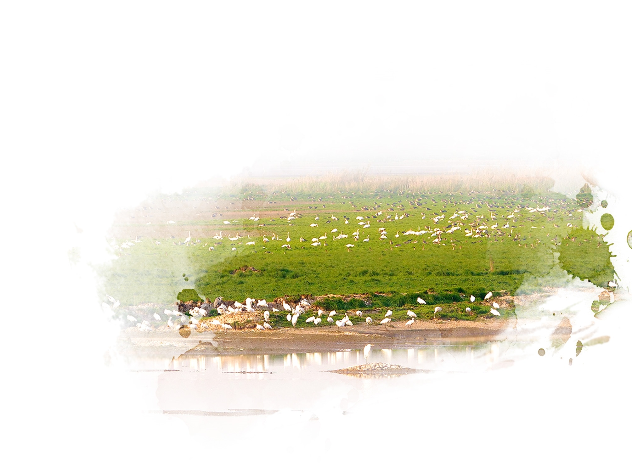 鸟鸣欢叫的巨大声浪传来,王家涉湖到了!站在大堤望湖面,像撒了黑白芝麻一样,密密麻麻栖息着或褐或白的水鸟,场面甚是壮观,白琵鹭用似琵琶的喙在浅水中扫荡食物,一片青翠草甸上密集蹲着上百只鸭子享受阳光浴。