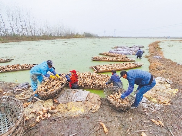 洪湖市雨钱莲藕种植专业合作社负责人洪晓俊张罗着工人采藕,看着一支支胖嘟嘟的莲藕出泥,心里特高兴。