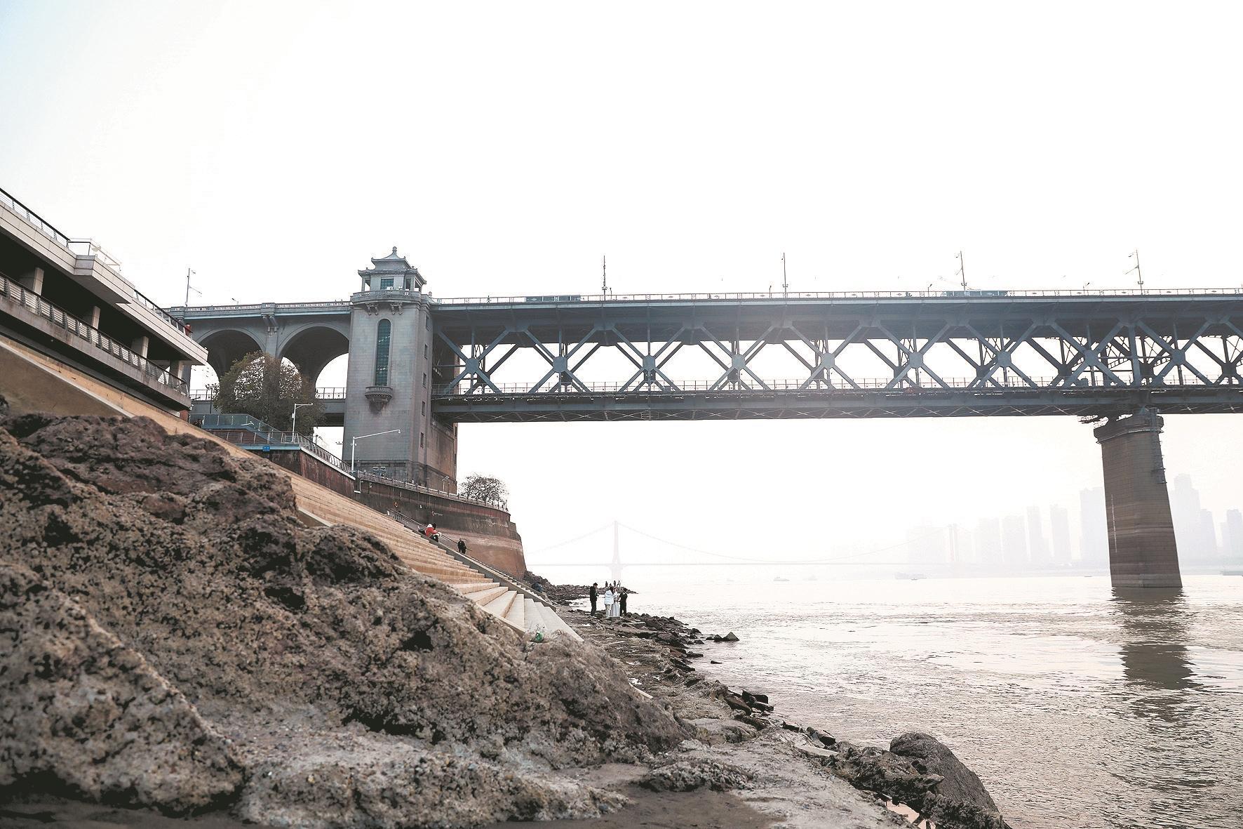 近日,因长江进入枯水期,武汉长江水位持续走低,汉口水位已下降至4米以下,航道浅窄,长江沿岸怪石沙滩凸显,吸引许多市民游玩拍照,亲近江水。