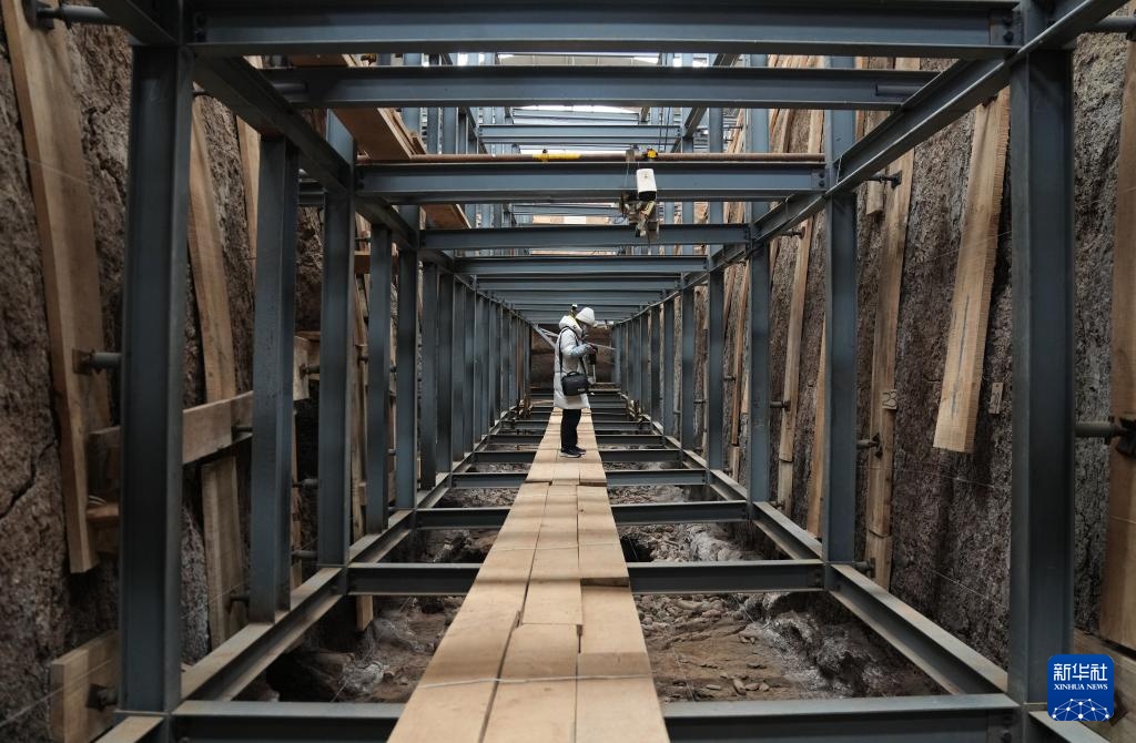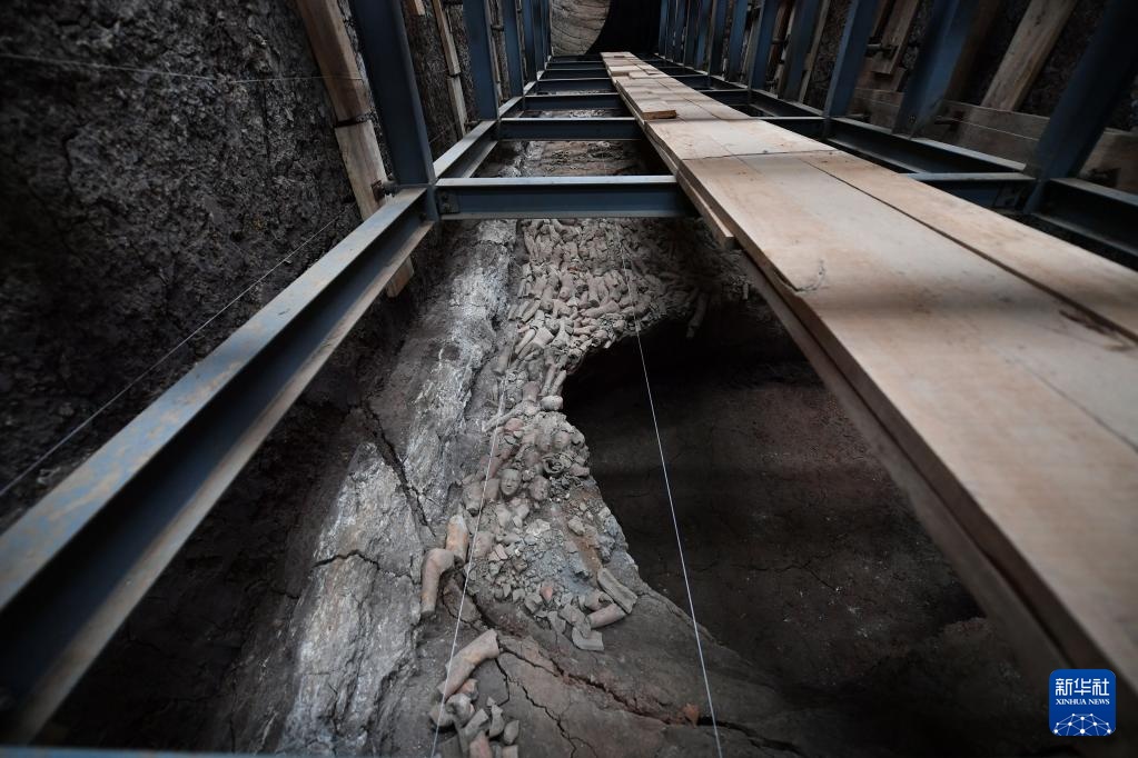 12月16日,媒体记者在江村大墓外藏坑内采访拍摄。