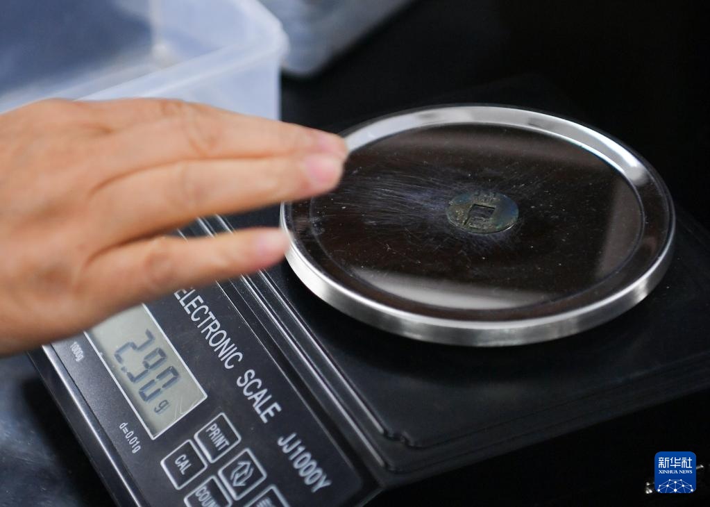 12月16日,工作人员对江村大墓出土的铜钱进行称重。