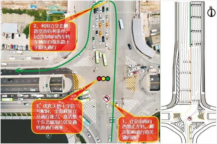 对太华路与自强东路十字北口车道分配进行优化,配合太华路立交桥上十字禁左措施的实施,对太华路与自强东路十字北口车道进行优化,在最内侧车道增设掉头专用车道,并增设掉头专用信号灯,当丁字路口由南向西左转信号放行时,允许立交十字南口左转车辆掉头向北通行,并通过立交十字北口右转完成左转通行需求。