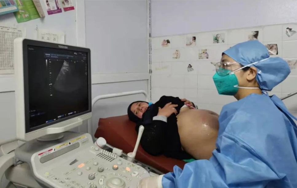 黄菊芳为产妇产检。
