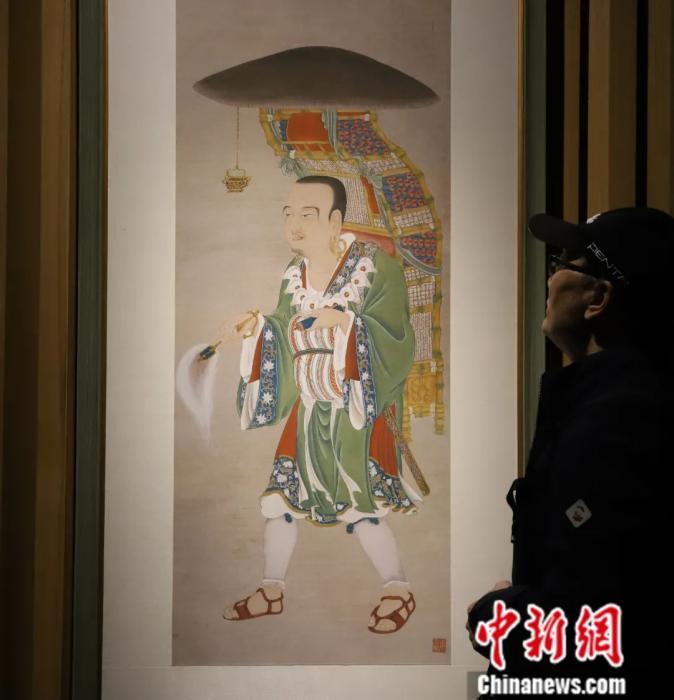 2019年11月,北京,参观者在“即心即佛——姜雪雁佛菩萨圣像画展”上参观《玄奘负笈取经图》。中新社发 郭海鹏 摄