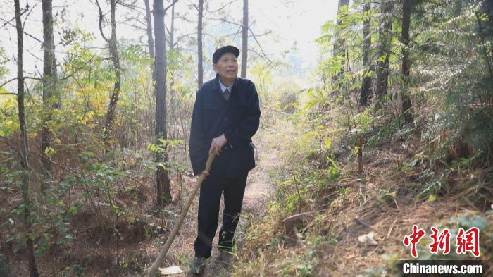 中新网永州12月17日电 (张祖智 廖湘)一把锄头、一双布鞋,爬过屋后山坡,来到山丘上的松树林,99岁的杨贵财用布满老茧的大手抚摸树干,巡视树林。