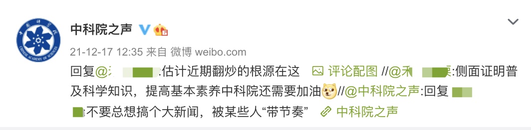 12月17日,@中科院之声 在回复网友类似质疑时,称“不要总想搞个大新闻,被某些人‘带节奏’。”