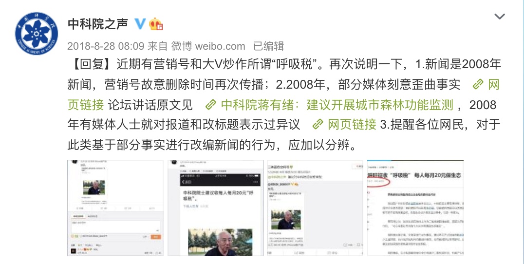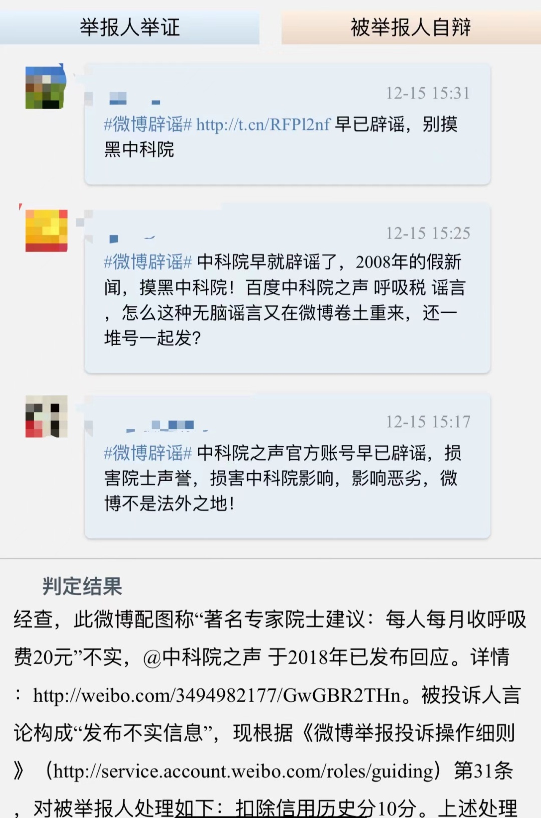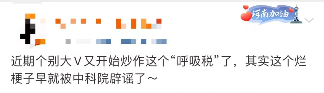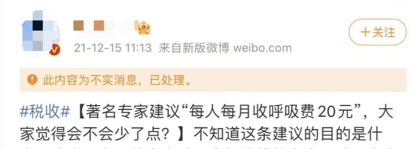 此外,记者注意到,就在两天前,一位粉丝近百万的大V发布“专家建议征收呼吸税”的消息,被网友举报为不实消息。