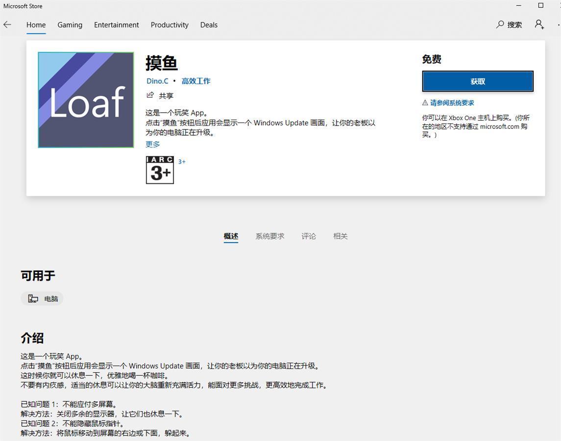 12月10日,Win10商店上架了一款名为“摸鱼”的APP,下载后点击“摸鱼”按钮,电脑会出现模拟更新界面,然后就可以放心大胆地“摸鱼”了。