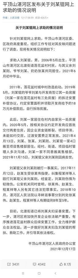 情况说明还表示,下一步,湛河区将加快开发企业依法破产重整,有序推进莲花盆村群众后续安置工作,全力维护群众合法权益。进一步做好刘某夫妇及刘坤的帮扶、救助工作,并引导其依法维权。