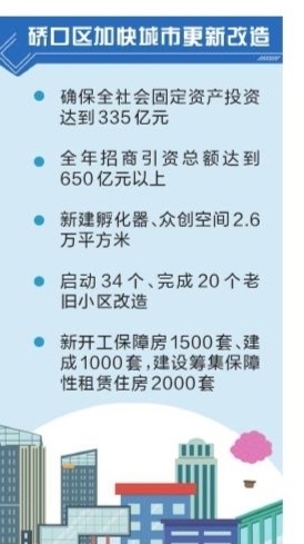 民生福祉无小事,一枝一叶总关情。硚口区提出2022年新增就业2万人次,创业带动就业7800人。新增社保参保2万人次,低保实现应保尽保。启动34个、完成20个老旧小区改造,推动30个完成改造小区实现专业化物业管理。新开工保障房1500套、建成1000套,建设筹集保障性租赁住房2000套。新增社区养老服务设施7个。新改扩建中小学4所、幼儿园3所。开展文化惠民活动200场,承办体育活动20场。建设社区医院2个、急救站点7个,改造提升社区卫生服务中心1个,新增专家工作室2个。开展家庭医生志愿服务活动200场。