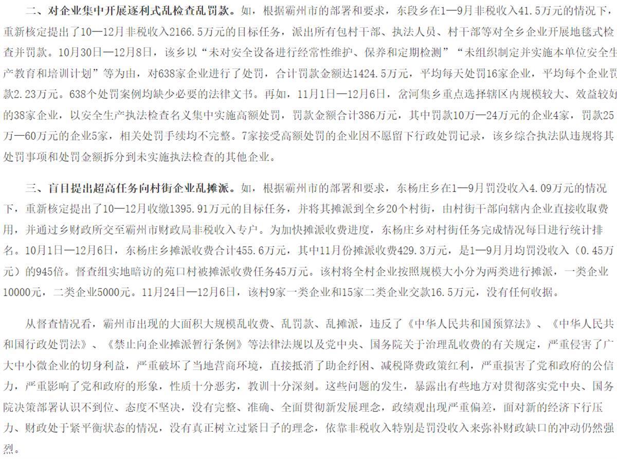 国办督查室的通报中还提到,东杨庄乡在1—9月罚没收入4.09万元的情况下,重新核定提出了10—12月收缴1395.91万元的目标任务,并将其摊派到全乡20个村街,由村街干部向辖内企业直接收取费用,并通过乡财政所交至霸州市财政局非税收入专户。