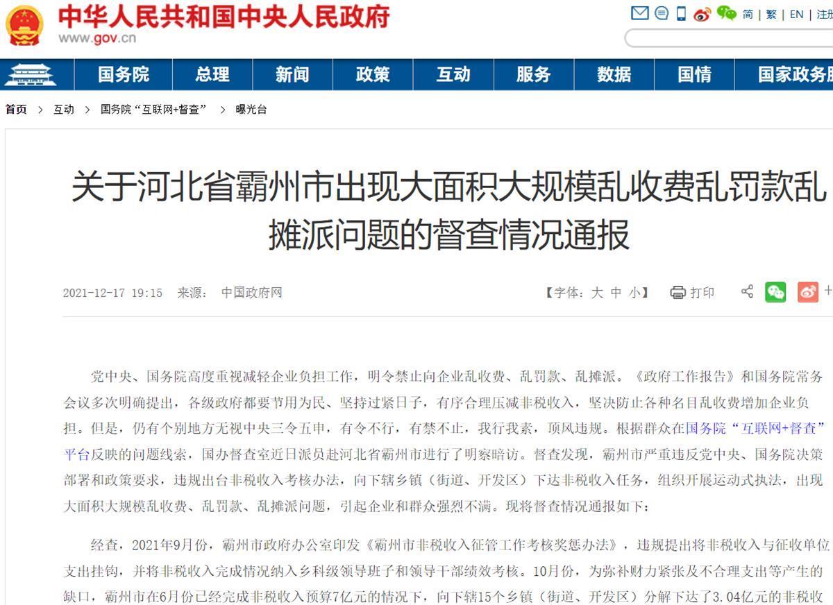 根据群众在国务院“互联网+督查”平台反映的问题线索,国办督查室近日派员赴河北省廊坊市霸州市进行了明察暗访,发现霸州市违规出台非税收入考核办法,向下辖乡镇(街道、开发区)下达非税收入任务,组织开展运动式执法,出现大面积大规模乱收费、乱罚款、乱摊派问题。12月18日,霸州市当地几家企业向极目新闻记者证实,已经收到有关部门的退款。