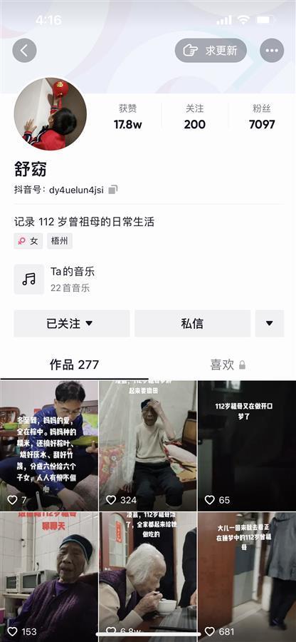 张女士:很久之前就开始拍视频记录了,去年12月我才开始上传到抖音上。一开始就是想着,祖母年纪也大了,就想把生活里的那些点点滴滴记录下来,以后也能留给孩子们看。