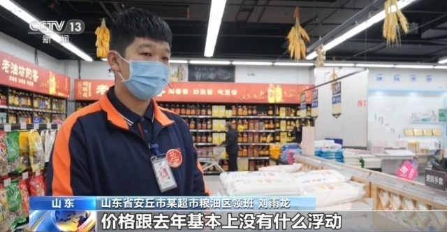 山东省安丘市某超市粮油区领班 刘雨龙:现在门店里有12至15种面粉,价格跟去年比基本上没有什么浮动。